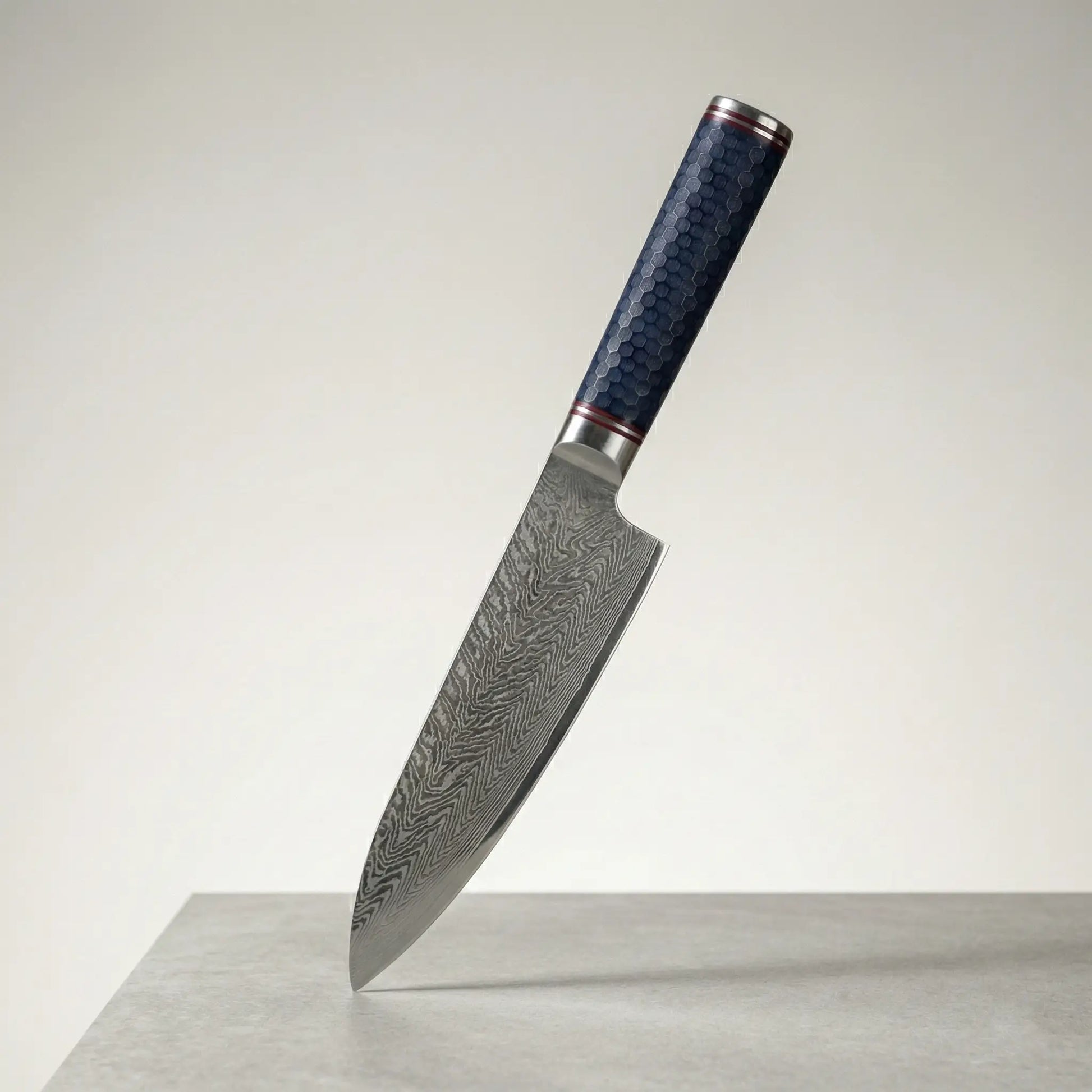 Forgées à partir de 67 couches d'acier Damas, nos lames conservent leur tranchant jusqu'à trois fois plus longtemps que l'acier inoxydable conventionnel. Avec un entretien approprié, elles offrent une précision constante pendant des années.