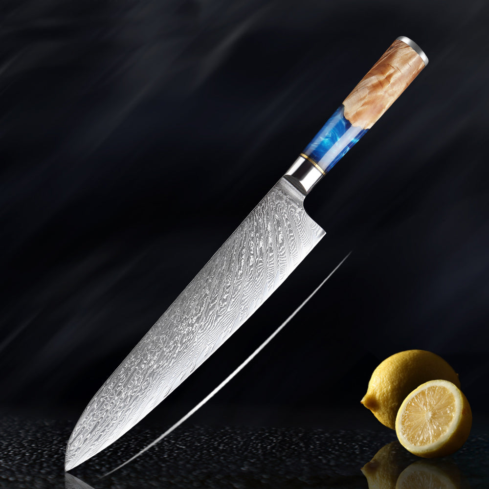 Introducing the Umi Chef's Knife – a masterpiece of culinary craftsmanship. This high-quality Damascus steel European-style knife features a mesmerizing wave-like pattern on its blade, reminiscent of the sea and shore. The luxurious resin handle captures the colors of the ocean, providing both comfort and elegance. Experience the artistry and precision of the Umi Chef's Knife, elevating your culinary creations to new heights.